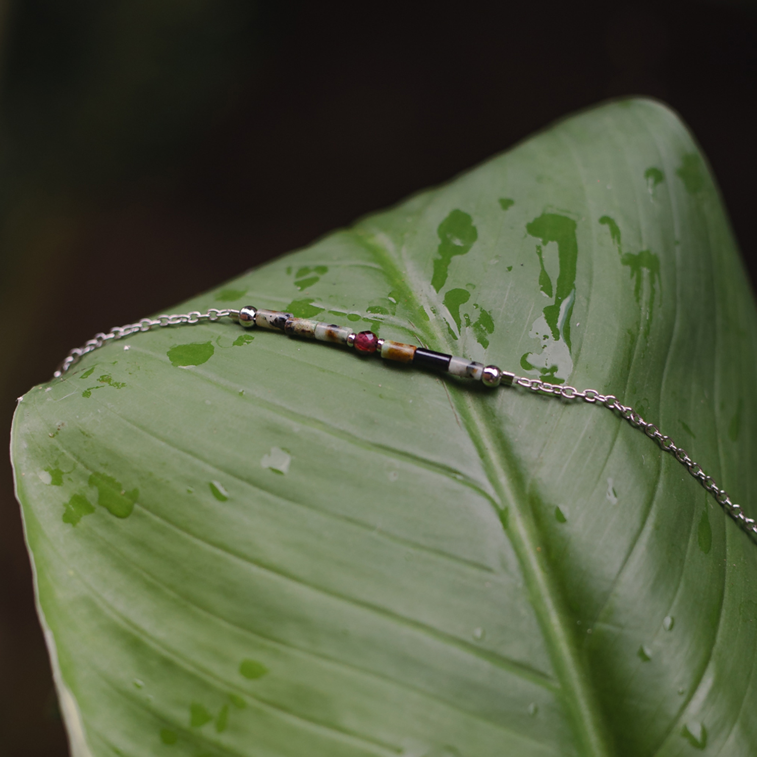 A Rin a szilárd, mégis áramló erőt hordozza, azt a belső tartást, amely a nyugalomból fakad. Természetes földszínei az erdő, a kő és a tűz elemeit egyesítik: a stabilitás, a védelem és az életerő energiáit. Ez az ékszer emlékeztet, hogy az igazi erő nem harsány, hanem mély, csendes és állandó.