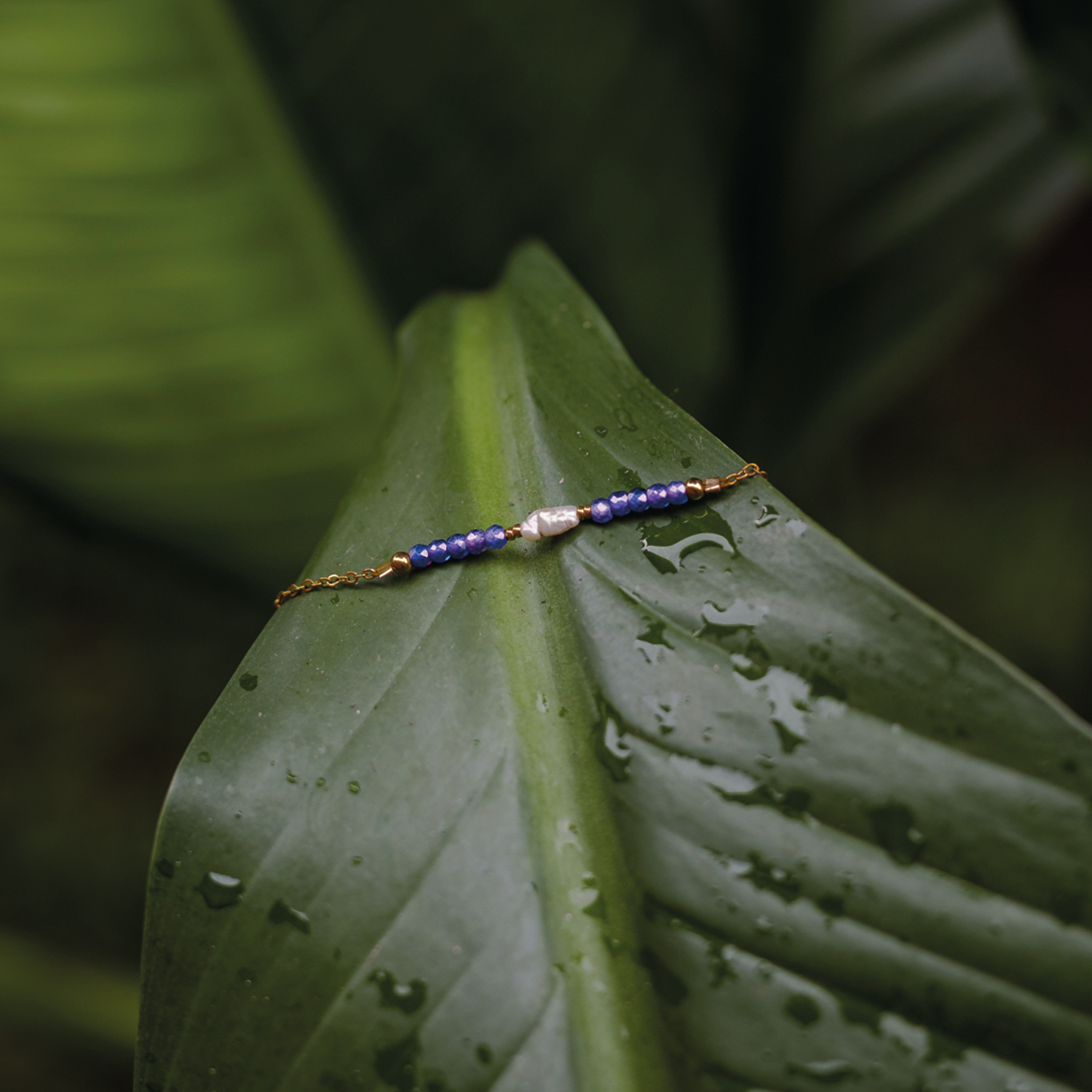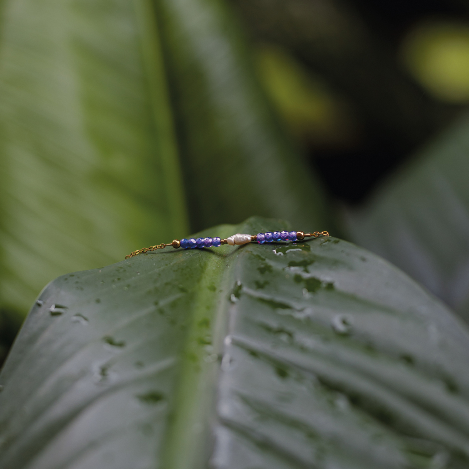 A Tsukihane („holdszárny”) karkötő az esti égbolt lilás-kék derengését hordozza magában. Az iolit misztikus, finoman változó színe a holdfény játékát idézi a víz felszínén, míg a gyöngy középen tiszta, lágy ragyogással egyensúlyozza a kompozíciót.